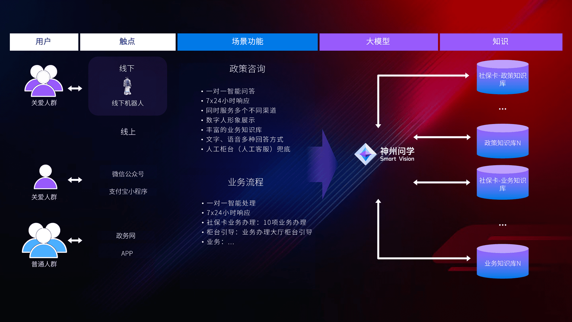 • 利用大语言模型+RAG技术,,,,支持多轮对话,,可识别多种同义词、、近义词,,精准理解关爱人群语义快速输出结果。。